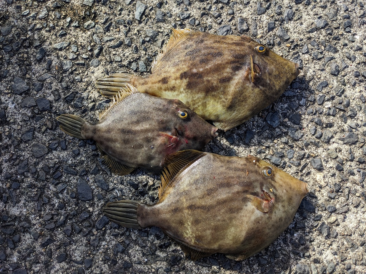 湾内波止釣りに、カワハギ25㎝クラス頭に1人5~6枚釣れていました!!